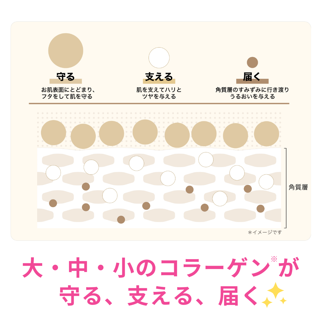 ※2 加水分解コラーゲン、水溶性コラーゲン、ポリグルタミン酸、 ヒアルロン酸Na(全て保湿成分)、シリカ、セテアリルアルコール、 セテアリルグルコシド、アルギン酸Na、ポリーεーリシン、クエン酸、 クエン酸Na(全て基剤)